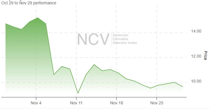The worst performing MSO in November was Ayr Wellness (OTC: AYRWF) (CSE: AYR.A), which lost 69.0% as it neared its all-time low price during the month. Glass House Brands (OTC: GLASF) (NEO: GLAS.A.U) was the strongest stock, falling 7.2%.
