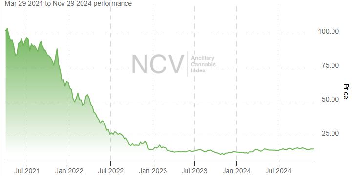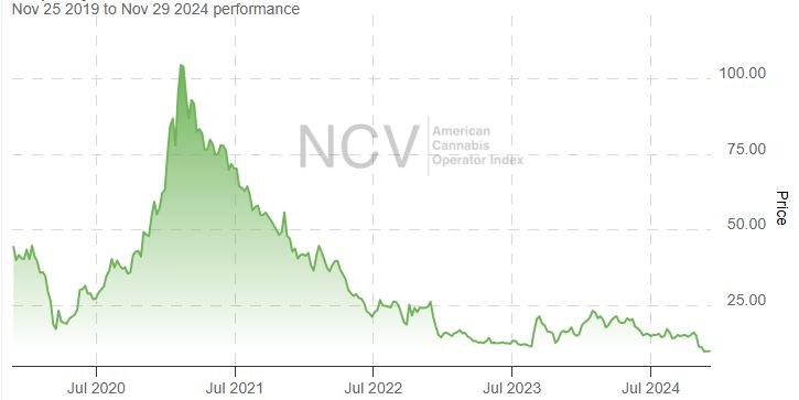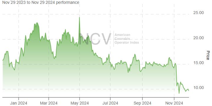 As we described in an article released earlier, the Global Cannabis Stock Index moved lower in November, falling 9.5%. It is now down 8.3% in 2024.