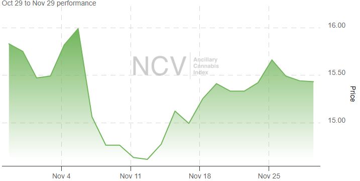 The Ancillary Cannabis Index was very strong in March but fell slightly in April. In July, it outpaced the other sub-sectors, but it pulled back in August. It fell just 0.3% in November to 15.43: