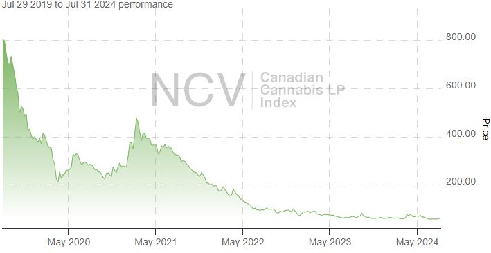 After a massive loss of 76.6% in 2022, it declined 10.9% in 2023 to 13.38, which was better than the Global Cannabis Stock Index. It is up 17.4% in 2024:
