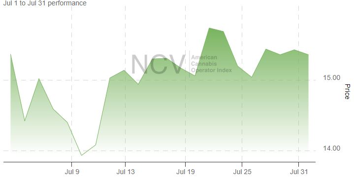 The worst performing MSO in July was Schwazze (OTC: SHWZ) (CSE: SHWZ), which lost 49.9%. Ascend Wellness (OTC: AAWH) (CSE: AAWH.U ) was the strongest stock, rising 19.2%%.