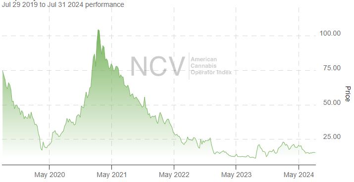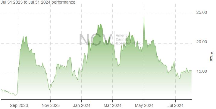 The American Cannabis Operator Index was quite strong in January after declining in December, but it plunged in February and then rallied in March and April. In May and June, it was weak, and in July, it lagged other sub-sectors, rallying just 0.4% to 15.36 :