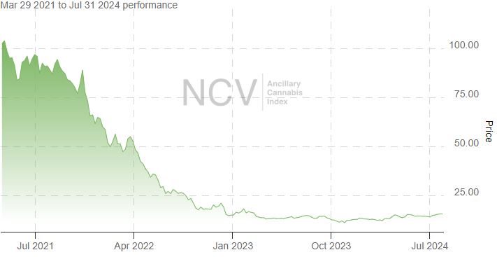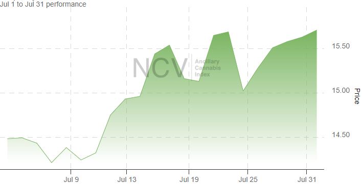 The Ancillary Cannabis Index was very strong in March but fell slightly in April. In July, it outpaced the other sub-sectors, rising 9.6% to 15.71: