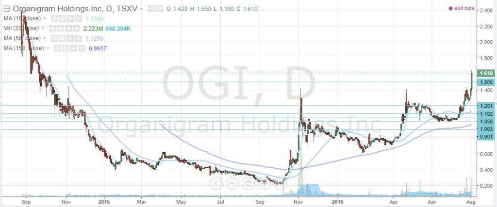 Today, on the heels of the $25mm Aphria deal announced last week and later increased to $30mm, Organigram (TSXV: OGI) (OTC: OGRMF) trading was halted near the close today in advance of a press release detailing a $17.5mm “bought deal” to sell shares to a syndicate of underwriters led by Dundee Securities. 13.47mm shares will be offered to the public at a price of $1.30, with the potential for the deal to be increased to over $20mm if the underwriters exercise their over-allotment option. The financing is expected to close on or about August 24th, when Health Canada is expected to announce potential changes to the MMPR program.