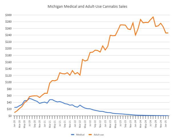 The Michigan Cannabis Regulatory Agency breaks out sales by medical and adult-use, with medical sales falling 71.1% from a year ago to $0.6 million, down 11.3% sequentially, and adult-use sales decreasing 4.7% year-over-year to $246.6 million, flat sequentially: