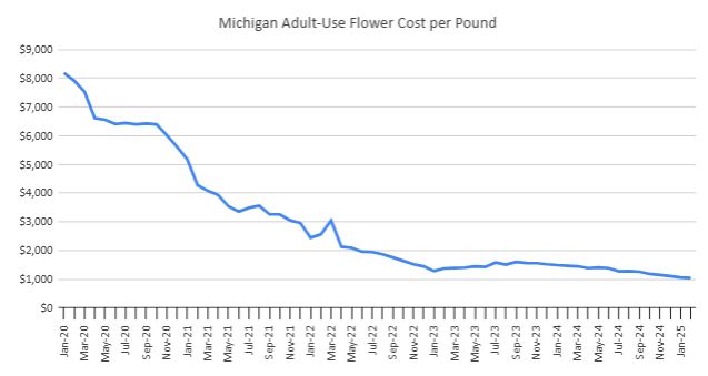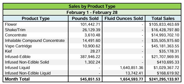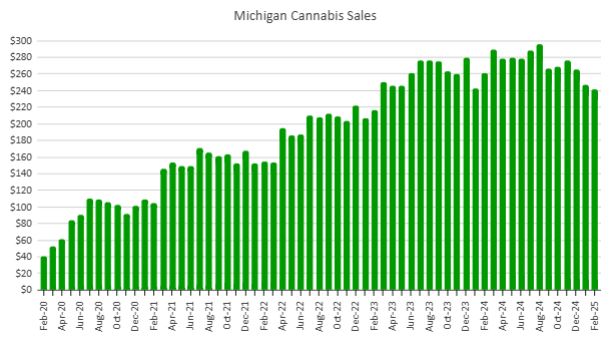 Michigan cannabis sales for February fell from a year ago and fell sequentially by 2.4%, which was up on a per-day basis. At $241.3 million, sales were down 7.6% from a year earlier: