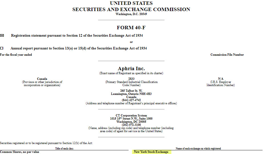Aphria (TSX: APH) (OTC: APHQF) has filed a Form 40-F that reveals it is intending to list on the New York Stock Exchange: