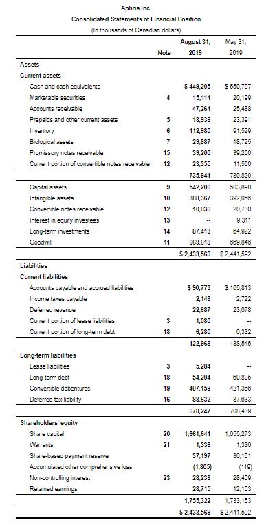 LEAMINGTON, ON, Oct. 15, 2019 /PRNewswire/ – Aphria Inc. (“Aphria” or the “Company“) (TSX: APHA and NYSE: APHA) today reported its results for the first quarter ended August 31, 2019. All amounts are expressed in thousands of Canadian dollars, unless otherwise noted and except for per gram, kilogram, kilogram equivalents, and per share amounts.