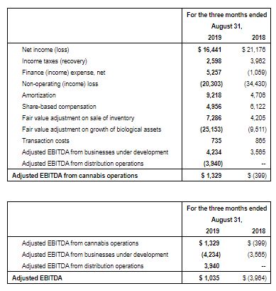 1 – In this press release, reference is made to adjusted cannabis gross profit, adjusted cannabis gross margin, adjusted distribution gross profit, adjusted distribution gross margin, adjusted net loss, adjusted EBITDA from cannabis operations, adjusted EBITDA from businesses under development, adjusted EBITDA from distribution operations, kilogram equivalents sold, cash costs to produce dried cannabis per gram, “all-in” costs to produce dried cannabis per gram and investments in capital and intangible assets – wholly-owned subsidiaries, which are not measures of financial performance under International Financial Reporting Standards (IFRS). These metrics and measures are not recognized measures under IFRS do not have meanings prescribed under IFRS and are as a result unlikely to be comparable to similar measures presented by other companies. These measures are provided as information complimentary to those IFRS measures by providing a further understanding of our operating results from the perspective of management. As such, these measures should not be considered in isolation or in lieu of review of our financial information reported under IFRS. Definitions and reconciliations for all terms above can be found in the Company’s August 31, 2019 Management’s Discussion and Analysis, filed on SEDAR and EDGAR.