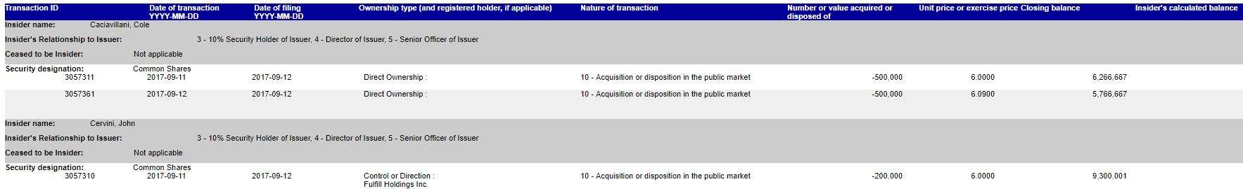 Cervini sold 200K shares on September 12th at $6.00 on September 11th, leaving him with 9.3mm shares held in Fulfill Holdings and 2.667mm shares held in his name. He had previously sold 1mm shares at $6.50 on March 1st and 1mm shares at $3.50 on October 12, 2016.