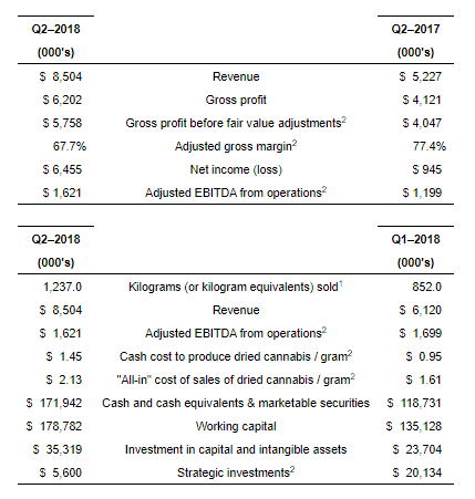 2 – In this press release, reference is made to (i) Gross profit before fair value adjustments, (ii) adjusted gross margin; (iii) adjusted EBITDA from operations; (iv) cash cost to produce dried cannabis per gram; (v) “all-in” cost of sales to produce dried cannabis per gram; and, (vi) strategic investments, which are not measures of financial performance under International Financial Reporting Standards. Definitions for all terms above can be found in the Company’s November 30, 2017 Management’s Discussion and Analysis, filed on SEDAR.