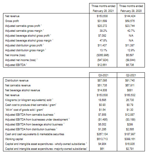 Net revenue for the three months ended February 28, 2021 was $153.6 million, an increase of 6.4% from $144.4 million in the same period last year. Third quarter fiscal year 2021 net revenue decreased 4.3% when compared to the prior quarter net revenue of $160.5 million, due to a decrease in net cannabis and distribution revenue, partially offset by an increase in net beverage alcohol revenue from the acquisition of SweetWater.
