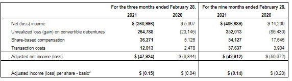 - Maintained its #1 licensed producer status in Ontario and Alberta in terms of sales to the provincial boards, based on Headset data for the period December 2020 to February 2021, the same as its prior fiscal quarter;