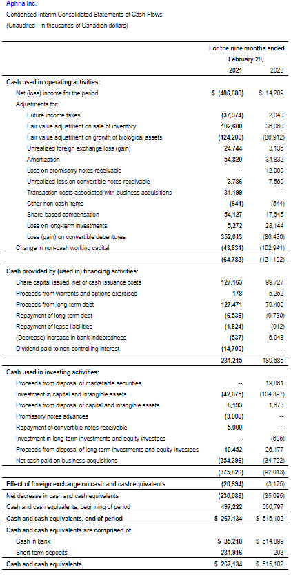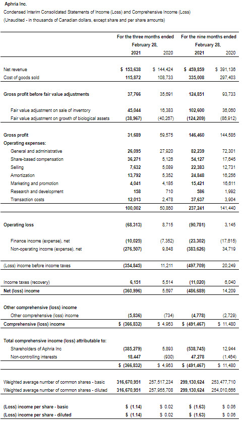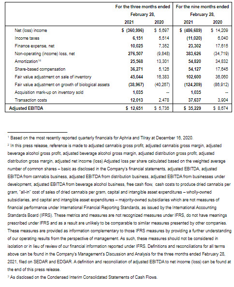 LEAMINGTON, ON, April 12, 2021 /PRNewswire/ – Aphria Inc. (“Aphria,” “we,” or the “Company”) (TSX: APHA) (NASDAQ: APHA), a leading global cannabis-lifestyle consumer packaged goods company inspiring and empowering the worldwide community to live their very best life, today reported its financial results for the third quarter and nine months ended February 28, 2021. All amounts are expressed in Canadian dollars, unless otherwise noted and except for per gram, kilogram, kilogram equivalents, and per share amounts.