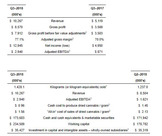 ²In this press release, reference is made to (i) Gross profit before fair value adjustments, (ii) adjusted gross profit; (iii) adjusted EBITDA; (iv) cash costs to produce dried cannabis per gram; (v) “all-in” costs of sales to produce dried cannabis per gram; and, (vi) Investment in capital assets and intangibles – wholly-owned subsidiares, which are not measures of financial performance under International Financial Reporting Standards. Definitions for all terms above can be found in the Company’s February 28, 2018 Management’s Discussion and Analysis, filed on SEDAR.