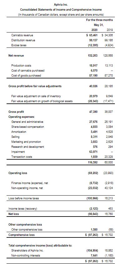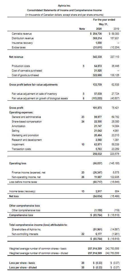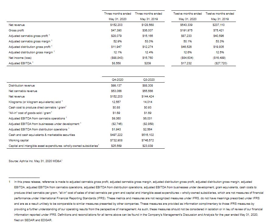 LEAMINGTON, ON, July 29, 2020 /PRNewswire/ – Aphria Inc. (“Aphria” or the “Company”) (TSX: APHA) (Nasdaq: APHA), a leading global cannabis company, today reported its financial results for the fourth quarter and fiscal year ended May 31, 2020. All amounts are expressed in Canadian dollars, unless otherwise noted and except for per gram, kilogram, kilogram equivalents, and per share amounts.