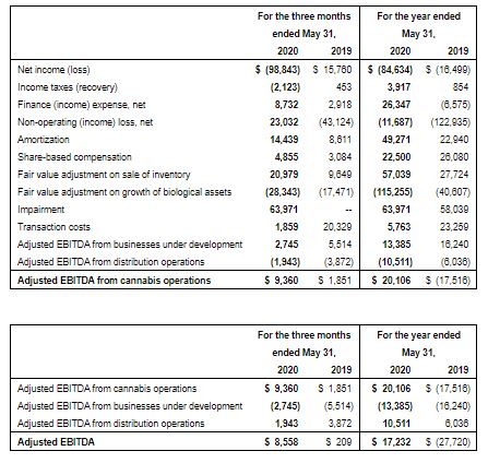 • Adjusted EBITDA from cannabis operations of $20.1 million in 2020, compared to a loss of $17.5 million in 2019.