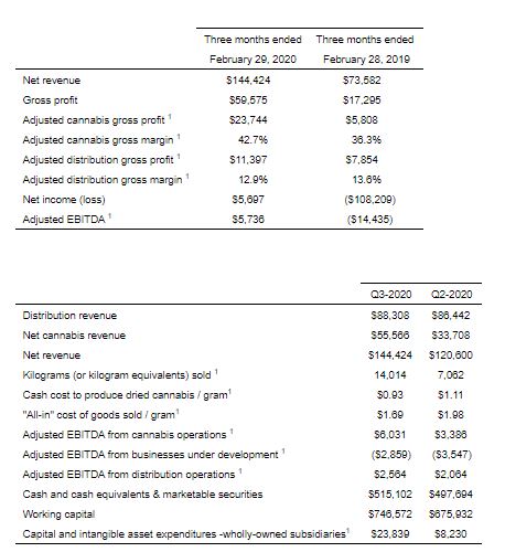 Net revenue for the three months ended February 29, 2020 was $144.4 million, an increase of 96% from $73.6 million in the same period last year. Third quarter fiscal 2020 net revenues were 20% higher when compared to the prior quarter net revenues of $120.6 million, largely due to an increase in net cannabis revenue from sales to provincial control boards. Net revenue included 8,171 kilogram equivalents sold for the adult-use market, 1,352 kilogram equivalents for medical cannabis sales and 4,491 kilogram equivalents sold in the wholesale market.