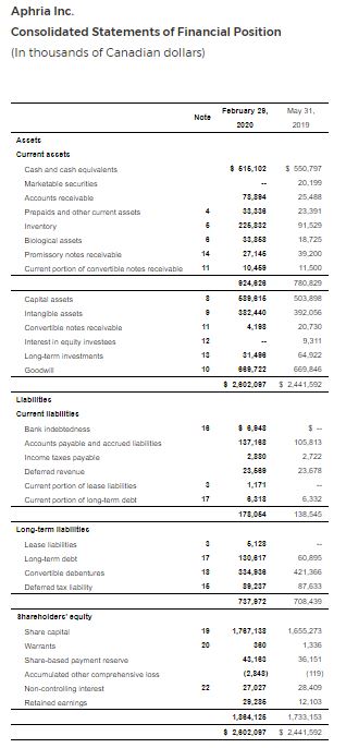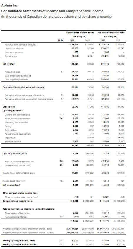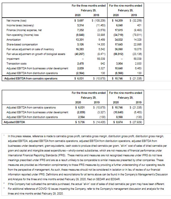 LEAMINGTON, ON, April 14, 2020 /PRNewswire/ – Aphria Inc., (“Aphria” or the “Company”) (TSX: APHA and NYSE: APHA) a leading global cannabis company, today reported its financial results for the third quarter ended February 29, 2020. All amounts are expressed in Canadian dollars, unless otherwise noted and except for per gram, kilogram, kilogram equivalents, and per share amounts.