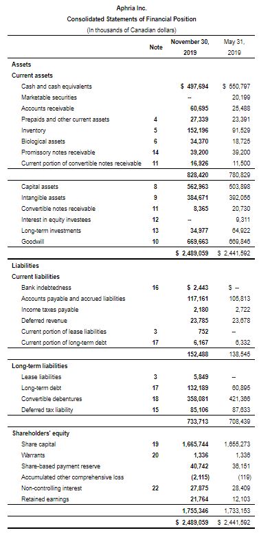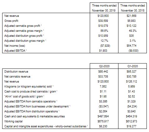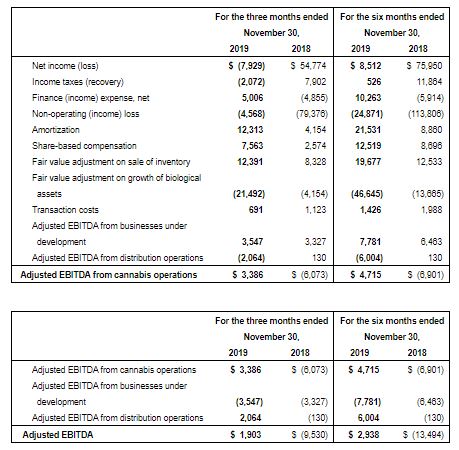 1 – In this press release, reference is made to adjusted cannabis gross profit, adjusted cannabis gross margin, adjusted distribution gross profit, adjusted distribution gross margin, adjusted EBITDA, net loss, adjusted EBITDA from cannabis operations, adjusted EBITDA from businesses under development, adjusted EBITDA from distribution operations, kilogram equivalents sold, cash costs to produce dried cannabis per gram, “all-in” costs to produce dried cannabis per gram and investments in capital and intangible assets – wholly-owned subsidiaries, which are not measures of financial performance under International Financial Reporting Standards (IFRS). These metrics and measures are not recognized measures under IFRS do not have meanings prescribed under IFRS and are as a result unlikely to be comparable to similar measures presented by other companies. These measures are provided as information complimentary to those IFRS measures by providing a further understanding of our operating results from the perspective of management. As such, these measures should not be considered in isolation or in lieu of review of our financial information reported under IFRS. Definitions and reconciliations for all terms above can be found in the Company’s November 30, 2019 Management’s Discussion and Analysis, filed on SEDAR and EDGAR.