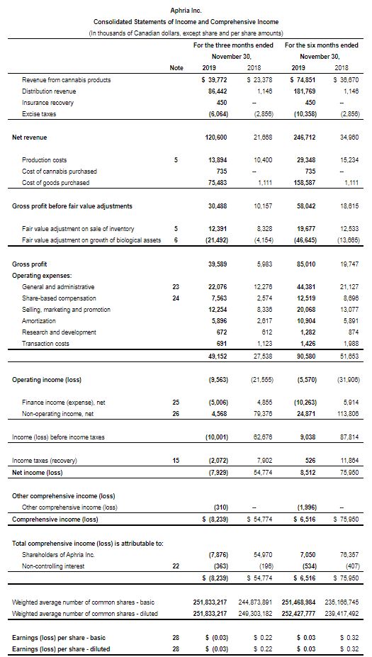 LEAMINGTON, ON, Jan. 14, 2020 /PRNewswire/ – Aphria Inc. (“Aphria” or the “Company”) (TSX: APHA and NYSE: APHA) today reported its results for the second quarter ended November 30, 2019. All amounts are expressed in thousands of Canadian dollars, unless otherwise noted and except for per gram, kilogram, kilogram equivalents, and per share amounts. The Company also announced that Irwin D. Simon, will officially remove “interim” from his title, effective today. In addition to his responsibilities as Aphria’s Chairman of the Board, Mr. Simon had been serving as Interim Chief Executive Officer since February 2019.