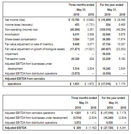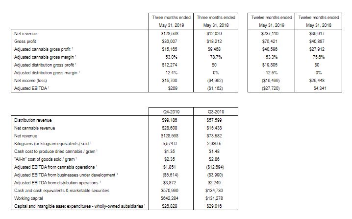 ¹ – In this press release, reference is made to adjusted cannabis gross profit, adjusted cannabis gross margin, adjusted distribution gross profit, adjusted distribution gross margin, adjusted net loss, adjusted EBITDA from cannabis operations, adjusted EBITDA from businesses under development, adjusted EBITDA from distribution operations, kilogram (or kilogram equivalents) sold, cash costs to produce dried cannabis per gram, “all-in” costs to produce dried cannabis per gram and investments in capital and intangible assets – wholly-owned subsidiaries, which are not measures of financial performance under International Financial Reporting Standards (IFRS). These metrics and measures are not recognized measures under IFRS do not have meanings prescribed under IFRS and are as a result unlikely to be comparable to similar measures presented by other companies. These measures are provided as information complimentary to those IFRS measures by providing a further understanding of our operating results from the perspective of management. As such, these measures should not be considered in isolation or in lieu of review of our financial information reported under IFRS. Definitions and reconciliations for all terms above can be found in the Company’s May 31, 2019 Management’s Discussion and Analysis, filed on SEDAR and EDGAR.