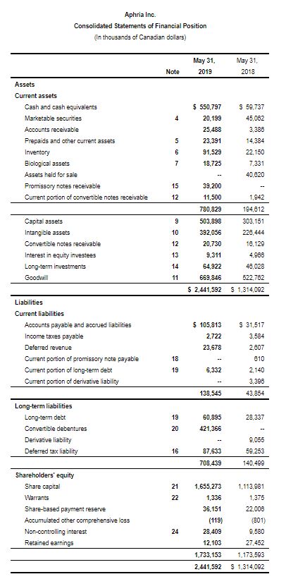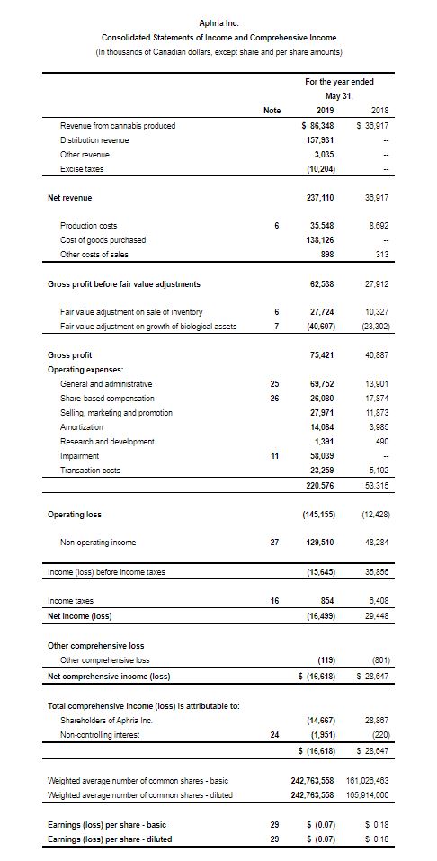LEAMINGTON, ON, Aug. 1, 2019 /PRNewswire/ – Aphria Inc. (“Aphria” or the “Company”) (TSX: APHA and NYSE: APHA) today reported its results for the fourth quarter and fiscal year ended May 31, 2019. All amounts are expressed in thousands of Canadian dollars, unless otherwise noted and except for per gram, kilogram, kilogram equivalents, and per share amounts.