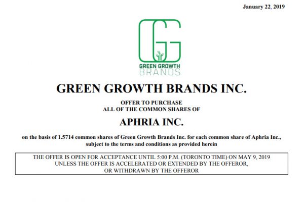 LEAMINGTON, ON, Feb. 6, 2019 /CNW/ – Aphria Inc. (“Aphria” or the “Company”) (TSX: APHA and NYSE: APHA) today announced that its Board of Directors (the “Board”) has rejected the hostile bid by Green Growth Brands Inc. (CSE:GGB) (“GGB”) to acquire all of the outstanding common shares of the Company (“Common Shares”) including any Common Shares that may become issued and outstanding after January 22, 2019, but prior to the expiry of the hostile bid upon the exercise, conversion or exchange of options, warrants, debentures or other securities of the Company exercisable or convertible into Common Shares, other than Common Shares owned by GGB or its affiliates, in exchange for 1.5714 shares of GGB (the “Hostile Bid”).