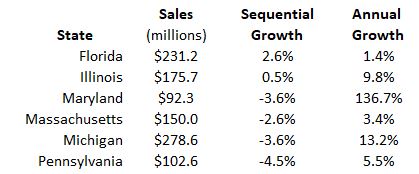 BDSA provides coverage for Florida, Illinois, Maryland, Massachusetts, Michigan and Pennsylvania. In April, year-over-year growth ranged from 1.4% in Florida to +136.7% in Maryland, which recently introduced adult-use. Note that Florida and Pennsylvania are medical-only markets. Sequential growth was positive in 2 markets. The annual growth in Florida fell from was the lowest yet, and annual growth was meager except in three states.