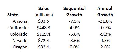 BDSA provides coverage for Arizona, California, Colorado, Nevada and Oregon. In April, year-over-year growth was negative in 3 of the 5 states, with the annual growth rates ranging from -21.8% in Arizona to 2.0% in Oregon. Growth fell sequentially in three of the states.