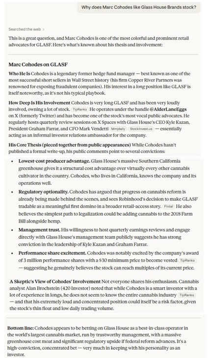 I am not trying to impact the price of Glass House Farms, as I have literally zero exposure to it. I have known Marc Cohodes for 50 years and like and respect him. I also think that the CEO of Glass House Farms, Kyle Kazan, and his employees are doing some good things.