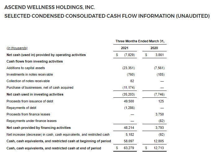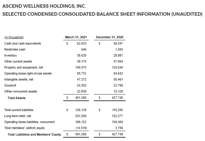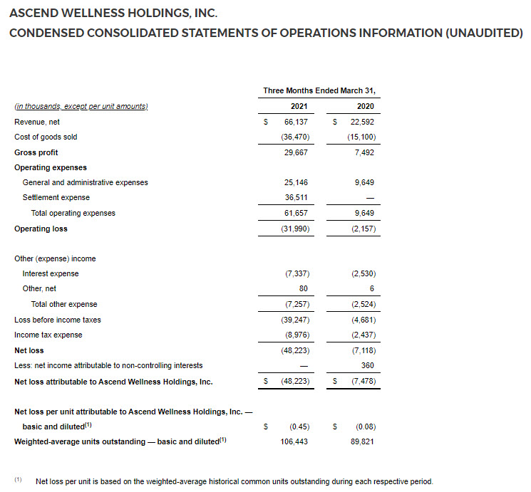 NEW YORK, May 18, 2021 /CNW/ – Ascend Wellness Holdings, Inc. (“AWH” or the “Company”) (CSE: AAWH.U), a vertically integrated multi-state operator focused on bettering lives through cannabis, today reported its financial results for the quarter ended March 31, 2021. The Company has applied to be quoted on the OTCQX, part of the OTC Markets Group. Financial results are reported in accordance with U.S. generally accepted accounting principles (“GAAP”) and all currency is in U.S. dollars.