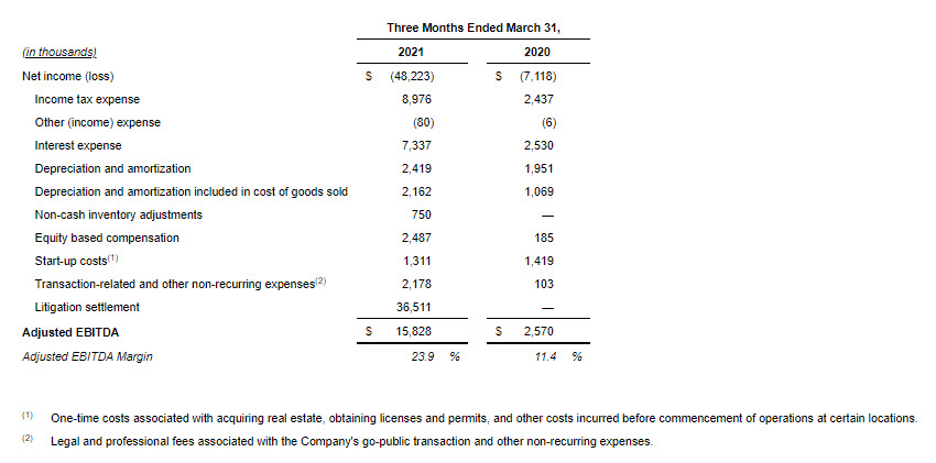 Total revenue during the first quarter of 2021 was $66.1 million, which represents an increase of 192.7% from $22.6 million during the first quarter of 2020 and an increase of 21.8% from $54.3 million during the fourth quarter of 2020. Revenue growth was driven by new store openings, increased traffic at open stores, and increase cultivation and production activity. The Company continues to invest in the build-out of its cultivation and manufacturing capabilities in Illinois, New Jersey, Massachusetts, and Michigan.