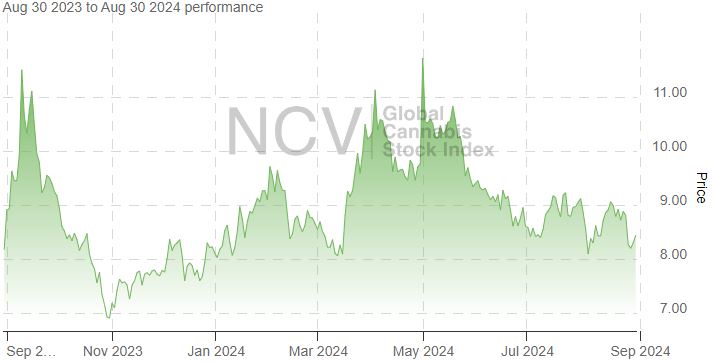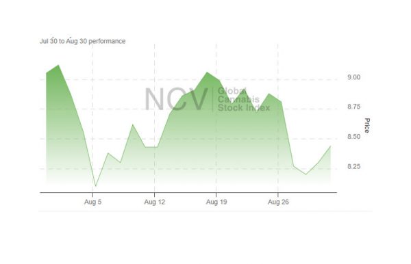 Cannabis stocks, as measured by the Global Cannabis Stock Index, passed the anniversary a year go when they exploded higher in late August on news that the Department of Health and Human Services had recommended to the DEA that it move cannabis from Schedule 1 to Schedule 3 with a weak month this August. The index had soared on the last day in April, when the DEA shared that it was officially recommending that rescheduling that had been requested, but it plunged in May and moved lower in June. In July and in the first part of August, the GCSI moved higher, but cannabis stocks fell sharply after the DEA announced late on August 26th that it was holding a hearing on December 2nd. For the month, the index was down 7.5% to 8.44:
