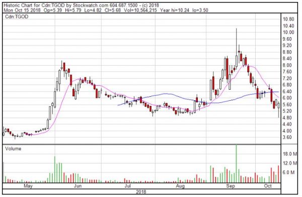 TGOD’s stock has been under pressure lately but still trades at a premium to the May IPO price of C$3.65: