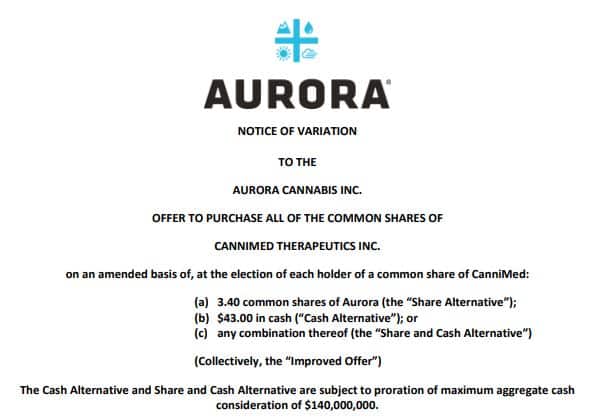 Pursuant to the terms of the Notice of Variation, Aurora has increased the consideration offered per CanniMed Share, at the election of each CanniMed shareholder, to: (a) 3.40 common shares (“Aurora Shares”) of Aurora (the “Share Alternative”); (b) $43.00 in cash (subject to proration); (the “Cash Alternative”); or (c) any combination thereof (subject to proration of the cash portion), (the “Share and Cash Alternative”).