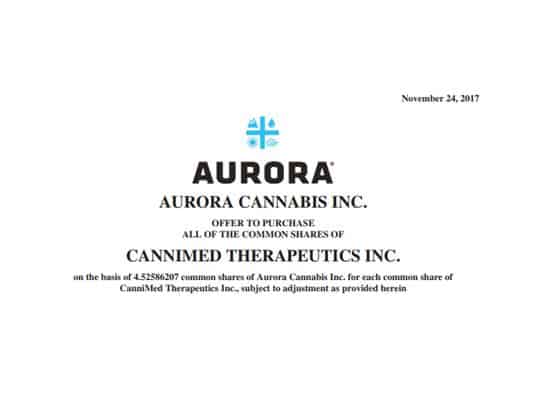 VANCOUVER, Nov. 24, 2017 /CNW/ – Aurora Cannabis Inc. (the “Company” or “Aurora”) (TSX: ACB) announced today that, further to its press release of November 17, 2017, it has formally commenced its offer (the “Offer”) to purchase all of the issued and outstanding common shares (the “CanniMed Shares”) of CanniMed Therapeutics Inc. (“CanniMed”) (TSX: CMED) for consideration consisting of common shares of Aurora (the “Aurora Shares”).