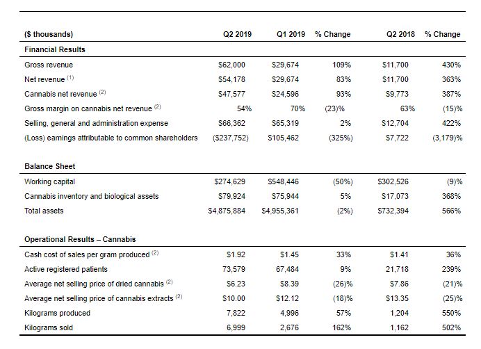 - Q2 2019 SG&A remained steady compared to the prior quarter as lower sales and marketing costs were offset by one-time public company and acquisition costs, as well as the absorption of a full quarter of SG&A costs from recently acquired companies, including MedReleaf.