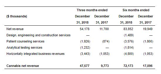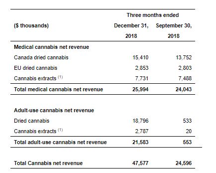 ¹For the three months ended December 31, 2018, cannabis extracts revenue includes cannabis oils, capsules, softgels and topical revenue. For the three months ended September 30, 2018, cannabis extracts revenue included cannabis oil and capsules.