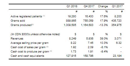 Total product sold for the period was 889,965 grams of dried cannabis and cannabis oils, up 104% as compared to 435,720 grams of dried cannabis in the first quarter of 2017, and up 17.9% from 755,059 grams in Q4 2017.