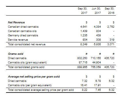 Revenues for the first quarter of fiscal 2018 were $8.2 million, up 168.6% from the same quarter in the prior year and up 39.0% from the previous quarter (Q4 2017). Revenue growth was achieved across all of the Company’s product lines and territories, driven predominantly by strong growth in Canadian cannabis oil sales, sales in Germany, and an increase in the average price per gram of product sold. The average price of product sold increased by 10.3% from $7.45 to $8.22 per gram, attributable mainly to strong increases in cannabis oils sold and sales through Pedanios in Germany.