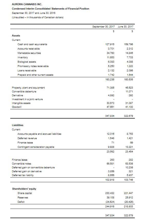 VANCOUVER, Nov. 9, 2017 /CNW/ – Aurora Cannabis Inc. (the “Company” or “Aurora”) (TSX: ACB) (OTCQX: ACBFF) (Frankfurt: 21P; WKN: A1C4WM) today announced its financial and operational results for the first quarter of fiscal 2018, ended September 30, 2017.