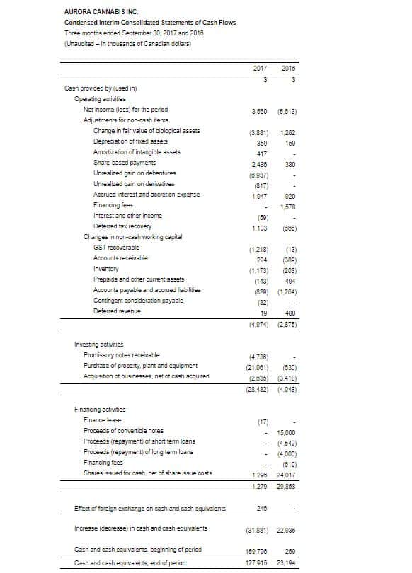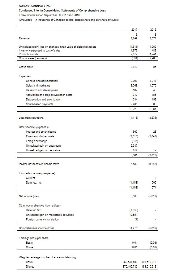 Net income before taxes of $4.7 million was recorded, as compared to a net loss before taxes of $6.3 million for the same quarter in the prior year. The increase was due predominantly due to higher revenues, an unrealized gain on the change in fair value of biological assets, as well as an unrealized gain on the $2.0 million Radient Technologies debenture Aurora invested in as part of its strategic collaboration.