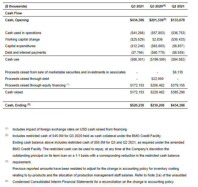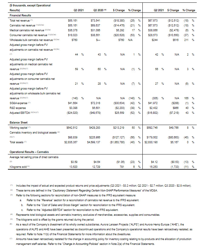 In Q3 2021, despite a decline in Canadian consumer revenue, the Company managed cash flow tightly using $35.9 million in cash to fund operations, excluding working capital investments and restructuring costs and other costs of $5.4 million. Cash used to pay for capital expenditures, net of disposals, in Q3 2021 was $12.2 million versus $83.9 million in Q3 2020 and $8.8 million in Q2 2021. Cash used in operations and for capital expenditures are crucial metrics in Aurora’s drive toward generating sustainable positive free cash flow, and both have improved significantly over the past year. The Company’s ongoing business transformation, with the additional cost efficiency savings described earlier, is expected to move the operating cash flow metric in a positive direction over the coming quarters.