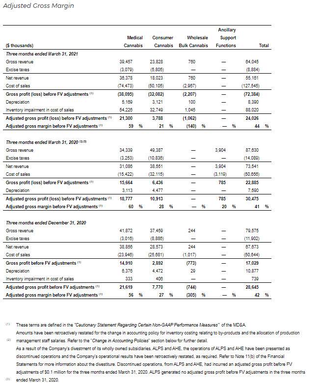 - Adjusted gross profit and gross margin before FV adjustments on medical cannabis net revenue represents adjusted gross profit and gross margin before FV adjustments on sales generated in the medical market only.