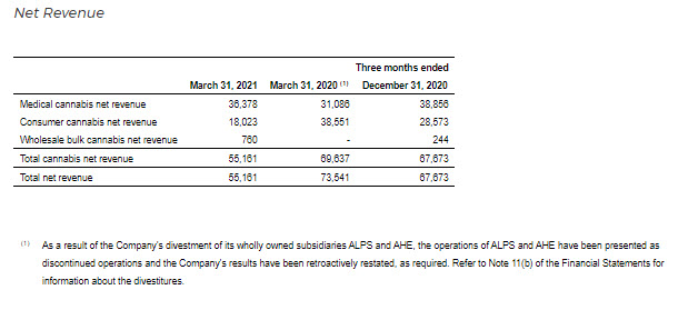 - Consumer cannabis net revenue represents cannabis net revenue for consumer cannabis sales only.