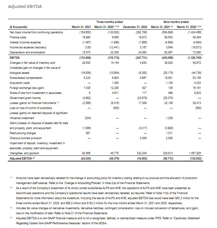 Included in the three months ended March 31, 2021 Adjusted EBITDA loss is $2.2 million (three months ended December 31, 2020 – $0.8 million) legal settlement and contract termination fees and $3.2 million (three months ended December 31, 2020 – $2.1 million) related to restructuring charges, severance and benefits associated with the business transformation plan, and $1.9 million (three months ended December 31, 2020 – $1.8 million) in revenue provisions as a result of our Company initiated product swap to replace low quality product with higher potency product at the provinces. Excluding these impacts, Adjusted EBITDA loss is $16.7 million (three months ended December 31, 2020 – $12.1 million).