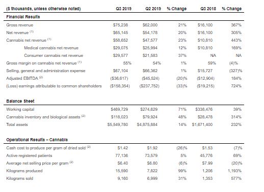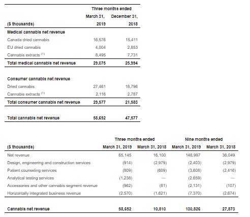 ¹Net revenue represents our total gross revenue exclusive of excise taxes levied by the Canada Revenue Agency (“CRA”) on the sale of medical and recreational cannabis products effective October 17, 2018.