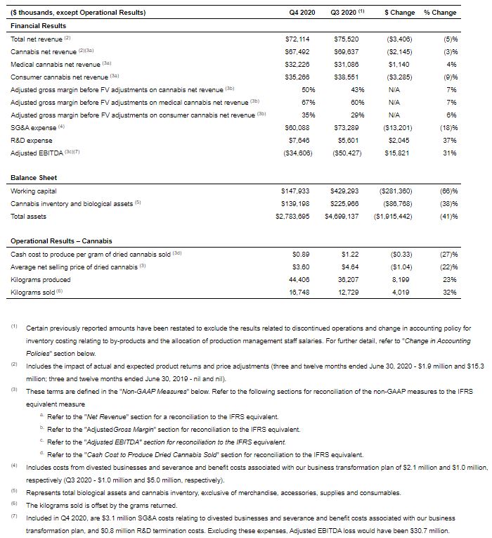 - Adjusted gross margin, before fair value adjustments on consumer cannabis net revenue¹ was 35% in Q4 2020, versus the 29% in the prior quarter. Despite the pressure on average selling price (“ASP”) in this segment, continued per-unit reductions in production costs supported a healthy average margin.