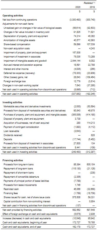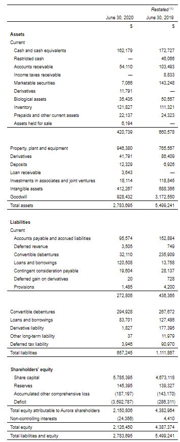 - Aurora recorded a number of balance sheet adjustments in Q4 2020 to recognize market realities and position the Company for future performance. These adjustments include fixed asset impairment charges of $86.5 million due to production facility rationalization, and a charge of $135.1 million in the carrying value of certain inventory, predominantly trim, in order to align inventory on hand with near term expectations for demand. Of the $135.1 million inventory impairment, $105.5 million is recognized through cost of sales and $29.6 million is recognized through changes in fair value of inventory sold on the statements of comprehensive loss. Finally, the Company recognized a non-cash write-down of goodwill and intangible assets of $1.6 billion.